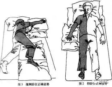 向患侧翻身:仰卧位,举起交叉的双手,先向健侧偏,再向患侧摆动,借助惯性,翻向患侧。因为可以充分利用患侧上、下肢。所以几乎不需要辅助。